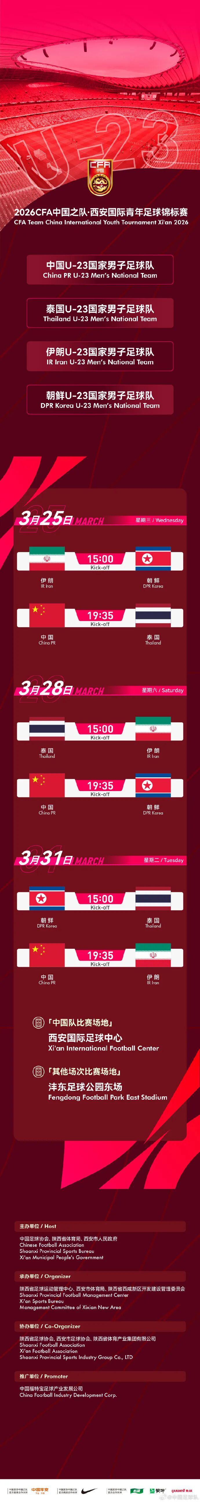 官方公告中写道:“2026CFA中国之队·西安国际青年足球锦标赛赛程正式公布!中国U-23国家男子足球队坐镇西安,迎战泰国队、朝鲜队、伊朗队三支劲旅。”